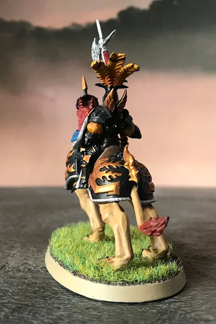 The riders got a similar treatment, starting with a black basecoat. A light, and I mean light drybrush of dark grey on the black will help bring back some details, but don't over do it. Pick some of the details out with gold and wash with red tone. The yellow on the shield and sleeves are the aforementioned Averland Sunset (GW). For a final spot color, I painted the reigns in a rich blue, which contrasts nicely and gives the model some visual interest. Then base the model to match the rest of your army.